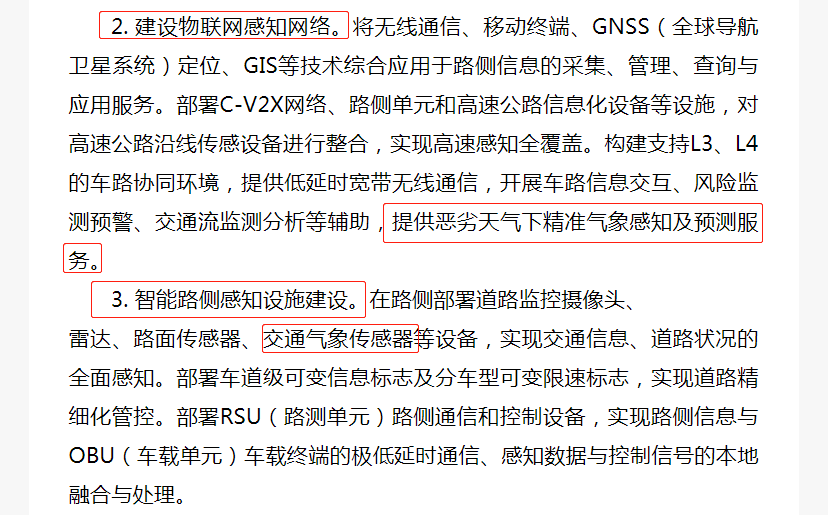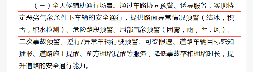 主要內(nèi)容中指出,要建設(shè)物聯(lián)網(wǎng)感知網(wǎng)絡(luò)與智能路側(cè)感知設(shè)施(如交通氣象傳感器、路面?zhèn)鞲衅鳎峁毫犹鞖庀職庀蟾兄邦A(yù)測服務(wù),提供路面異常情況預(yù)警(結(jié)冰,積雪,積水檢測)、危險(xiǎn)路段預(yù)警、局部氣象預(yù)警(團(tuán)霧,雨,雪,風(fēng))、二次事故預(yù)警、逆行/異常車輛行駛預(yù)警、可變限速、道路車輛目標(biāo)感知播報(bào)、道路施工提醒、前方擁堵提醒等服務(wù),降低事故率和擁堵時(shí)長,實(shí)現(xiàn)交通信息、道路狀況的全面感知,提升道路的安全通行能力。
